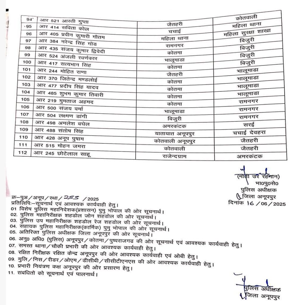 न्यामुद्दीन अली, अनूपपुर. मध्य प्रदेश के अनूपपुर जिले में पुलिस महकमे में एक बड़ी प्रशासनिक सर्जरी की गई है. पुलिस अधीक्षक मोती उर रहमान ने उन पुलिसकर्मियों के खिलाफ बड़ा कदम उठाया है, जो पिछले पांच वर्षों से एक ही थाने में जमे हुए थे. विभागीय संतुलन और कार्यक्षमता बढ़ाने की दिशा में उठाए गए इस कदम में जिले के विभिन्न थानों में पदस्थ 112 पुलिसकर्मियों का तबादला कर दिया गया है.