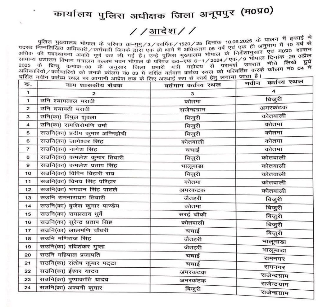 यह कदम सिर्फ ट्रांसफर की कार्यवाही नहीं, बल्कि जिले की पुलिसिंग को नई धार देने की पहल है. अब अनूपपुर पुलिस महकमा और अधिक प्रभावी, सजग और संवेदनशील बन सकेगा.