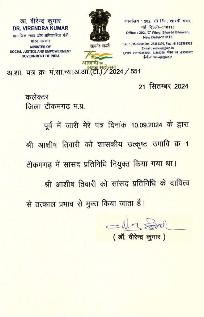 मुकेश सेन, टीकमगढ़/ सुधीर दंतोड़िया, भोपाल। टीकमगढ़ सांसद व केंद्रीय मंत्री वीरेंद्र खटीक ने कलेक्टर अवधेश शर्मा को पत्र जारी किया है. जिसमें उन्होंने लिखा है कि 10 सितंबर को आशीष तिवारी को टीकमगढ़ में सांसद प्रतिनिधि नियुक्त किया गया था. आशीष तिवारी को सांसद प्रतिनिधि के दायित्व से तत्काल प्रभाव से मुक्त किया जाता है.