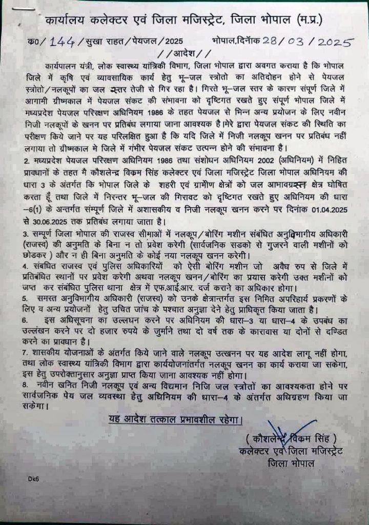 अगर कोई मशीन अवैध रूप से जिले में प्रवेश करती है या नलकूप खनन करती है, तो संबंधित एसडीएम और पुलिस अधिकारी मशीन को जब्त कर एफआईआर दर्ज करवा सकेंगे। आदेश का उल्लंघन करने पर दो हजार रुपए जुर्माना, दो साल की सजा या दोनों हो सकते हैं। मध्यप्रदेश पेयजल परिरक्षण अधिनियम की धारा 6 (1) के तहत पूरे जिले में निजी नलकूप खनन पर प्रतिबंध लगाया गया है। यह आदेश केवल निजी नलकूपों पर लागू होगा। शासकीय योजनाओं के तहत किए जा रहे नलकूप खनन कार्यों पर यह प्रतिबंध लागू नहीं होगा। पीएचई द्वारा संचालित कार्यों को परमिशन की जरूरत नहीं होगी