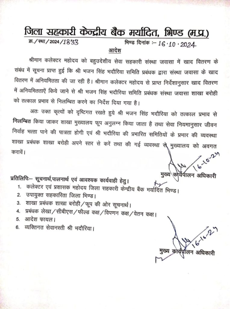 धर्मेंद्र ओझा, भिंड। मध्य प्रदेश के भिंड जिले में खाद संकट के बीच कलेक्टर ने बड़ी कार्रवाई करते हुए खाद वितरण में अनियमितता करने वाले समिति प्रबंधक भजन सिंह भदौरिया को निलंबित कर दिया है। समिति प्रबंधक पर किसानों के हिस्से की खाद को ब्लैक में बेचने के गंभीर आरोप लगे थे।