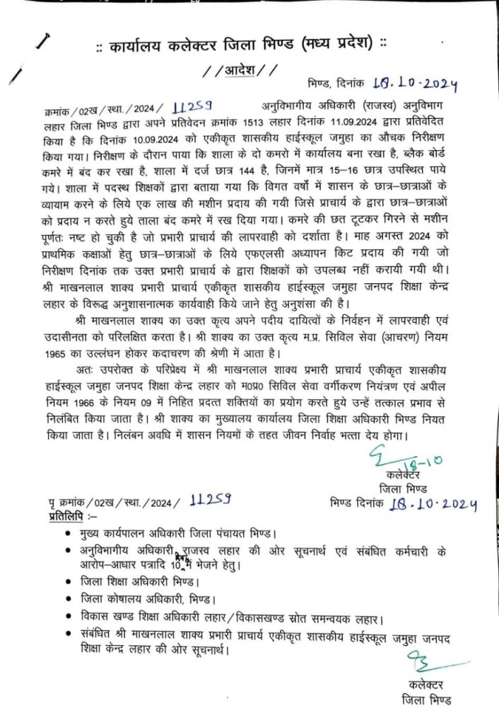 धर्मेंद्र ओझा, भिंड। मध्य प्रदेश के भिंड जिले के लहार तहसील के शासकीय हाई स्कूल जमुहॉ के प्रभारी प्राचार्य को काम में लापरवाही और उदासीनता बरतने के चलते निलंबित कर दिया गया है। SDM की रिपोर्ट के आधार पर कलेक्टर संजीव श्रीवास्तव ने यह कार्रवाई की है।