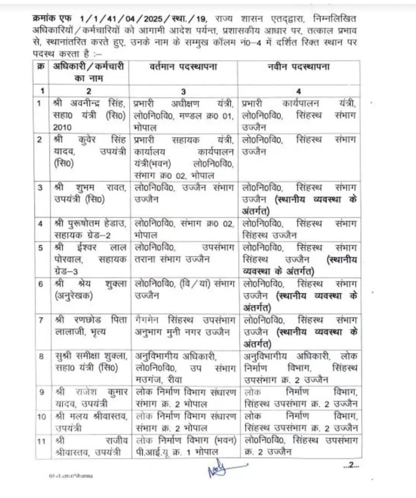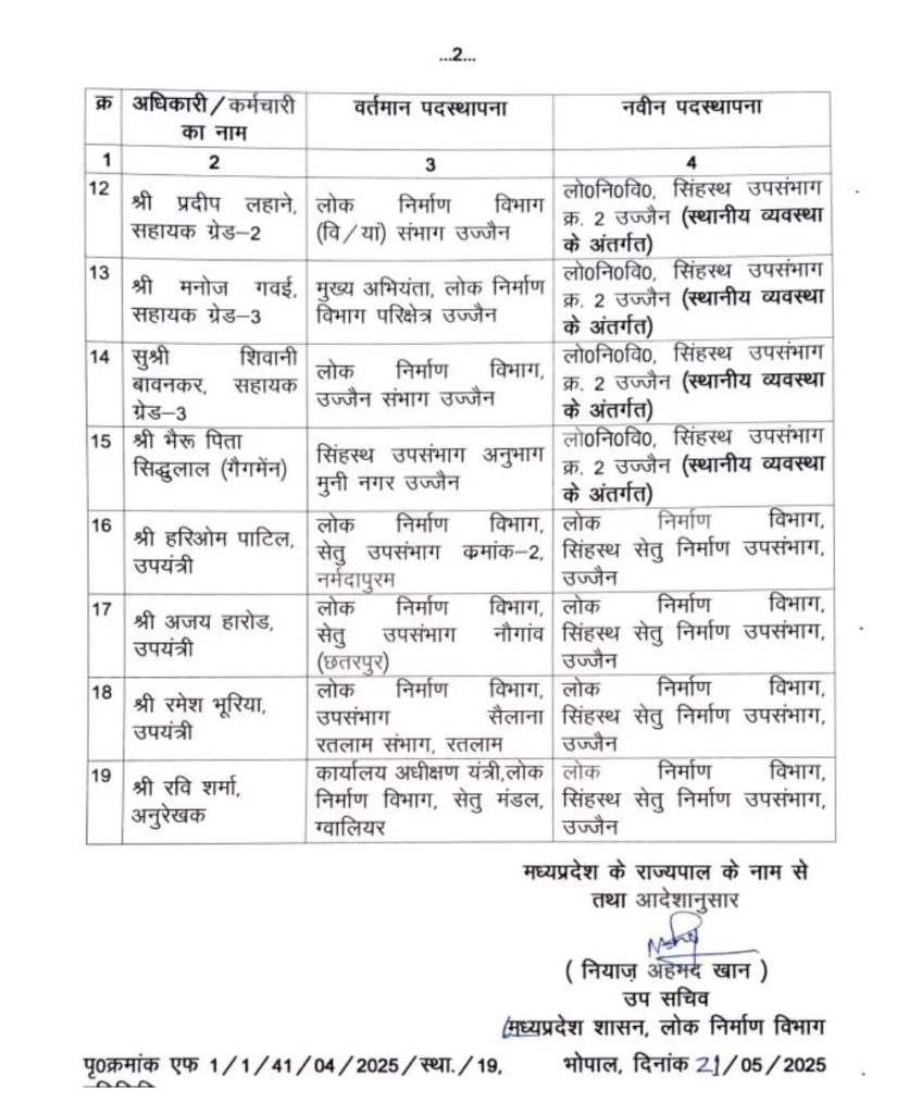 राकेश चतुर्वेदी, भोपाल. मध्य प्रदेश में तबादला का दौर जारी है. PWD ने 19 अधिकारी-कर्मचारियों के ट्रांफसर किए हैं. जिसका आदेश लोक निर्माण विभाग ने जारी कर दिया है. जारी आदेश के मुताबिक, अधिकारी-कर्मचारियों को उज्जैन की जिम्मेदारी सौंपी गई है.