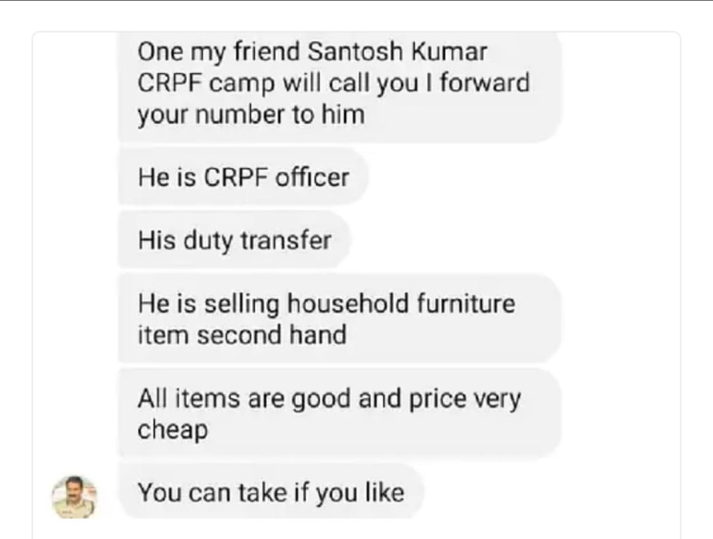 इसका एक स्क्रीनशॉट वायरल हो रहा है जिसमें उसने मैसेज कर कहा” मेरा एक मित्र संतोष कुमार सीआरपीएफ कैंप से आपको कॉल करेगा। मैं आपका नंबर उसे फॉरवर्ड कर दूंगा। वह सीआरपीएफ अधिकारी है। उसकी ड्यूटी ट्रांसफर हो गई है। वह घरेलू फर्नीचर का सामान सेकंड हैंड बेच रहा है। सभी सामान अच्छे हैं और कीमत भी बहुत सस्ती है। आप चाहें तो ले सकते हैं।”