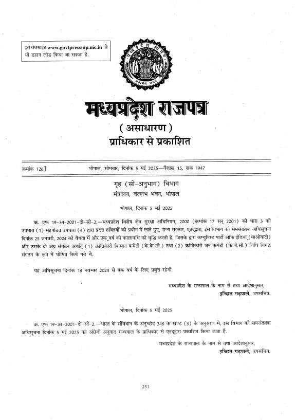 शब्बीर अहमद, भोपाल. मध्य प्रदेश में माओवादी संगठन (Maoist organization) पर बैन जारी रहेगा. गृह विभाग ने एक अधिसूचना जारी कर कम्युनिस्ट पार्टी ऑफ इंडिया के दो संगठन पर बैन को एक साल के लिए बढ़ा दिया है.
