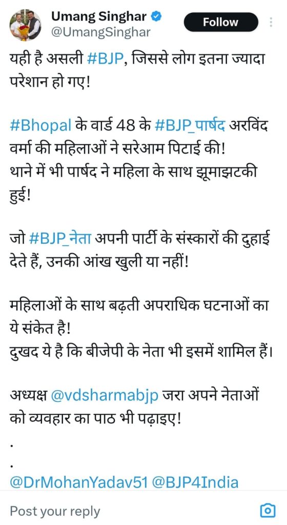 नेता प्रतिपक्ष उमंग सिंघार ने महिला सुरक्षा को लेकर सवाल उठाते हुए एक्स पर पोस्ट करते हुए लिखा, यही है असली बीजेपी, जिससे लोग इतना ज्यादा परेशान हो गए। भोपाल के वार्ड 48 के बीजेपी पार्षद अरविंद वर्मा की महिलाओं ने सरेआम पिटाई की। थाने में भी पार्षद ने महिला के साथ झूमाझटकी हुई। जो बीजेपी नेता अपनी पार्टी के संस्कारों की दुहाई देते हैं, उनकी आंख खुली या नहीं? महिलाओं के साथ बढ़ती आपराधिक घटनाओं का ये संकेत है। दुखद ये है कि बीजेपी के नेता भी इसमें शामिल हैं। बीजेपी अध्यक्ष जरा अपने नेताओं को व्यवहार का पाठ भी पढ़ाइए।