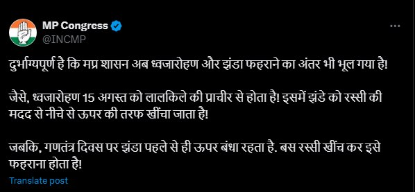राकेश चतुर्वेदी, भोपाल. मध्य प्रदेश में ध्वजारोहण पर सियासत तेज हो गई है. कांग्रेस ने 26 जनवरी के आदेश को लेकर सरकार को घेरा है. कांग्रेस ने अपने सोशल मीडिया अकाउंट X पर लिखा- “दुर्भाग्यपूर्ण है कि मप्र शासन अब ध्वजारोहण और झंडा फहराने का अंतर भी भूल गया है! जैसे, ध्वजारोहण 15 अगस्त को लालकिले की प्राचीर से होता है! इसमें झंडे को रस्सी की मदद से नीचे से ऊपर की तरफ खींचा जाता है! जबकि, गणतंत्र दिवस पर झंडा पहले से ही ऊपर बंधा रहता है. बस रस्सी खींचकर इसे फहराना होता है!”