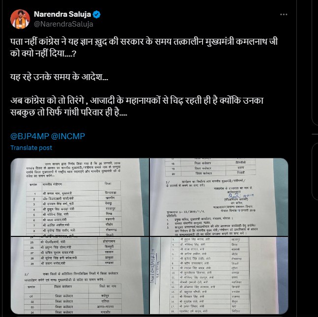 इधर, बीजेपी ने कमलनाथ सरकार के समय का आदेश पोस्ट कर पलटवार किया है. बीजेपी प्रवक्ता नरेंद्र सलूजा ने एक्स पर लिखा- “पता नहीं कांग्रेस ने यह ज्ञान ख़ुद की सरकार के समय तत्कालीन मुख्यमंत्री कमलनाथ जी को क्यो नहीं दिया….? यह रहे उनके समय के आदेश… अब कांग्रेस को तो तिरंगे, आजादी के महानायकों से चिढ़ रहती ही है क्योंकि उनका सबकुछ तो सिर्फ गांधी परिवार ही है….”