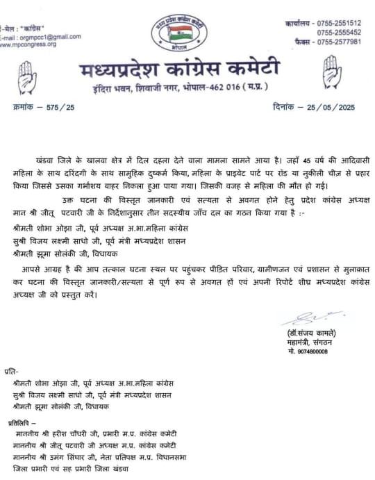 सुधीर दंडोतिया/शब्बीर अहमद, भोपाल. खंडवा गैंगरेप मामले में सियासत गरमा गई है. इस मामले में कांग्रेस ने जांच टीम का गठन किया है. जिसमें शोभा ओझा, विजयालक्ष्मी साधौ, झूमा सोलंकी को सदस्य बनाया गया है. जांच दल को मौके पर जाकर रिपोर्ट तैयार करने के निर्देश दिए गए हैं. इसके अलावा टीम पीड़ित परिवार से भी मुलाकात करेगी. जांच पूरी होने के बाद टीम पीसीसी चीफ को रिपोर्ट सौंपेगी. वहीं नेता प्रतिपक्ष उमंग सिंघार और पूर्व केंद्रीय मंत्री अरुण यादव ने भी सरकार पर जमकर निशाना साधा है.