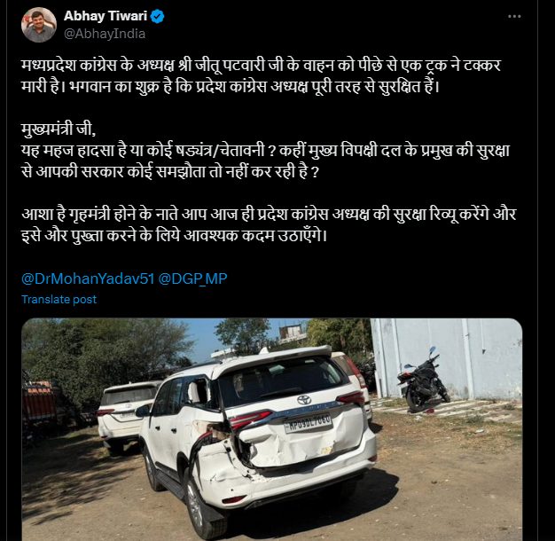 दरअसल, कांग्रेस के संचार विभाग प्रमुख अभय तिवारी ने एक्सीडेंट को षड्यंत्र बताते हुए अपने सोशल मीडिया एक्स पर पोस्ट शेयर किया है. जिसमें उन्होंने लिखा- मध्यप्रदेश कांग्रेस के अध्यक्ष जीतू पटवारी जी के वाहन को पीछे से एक ट्रक ने टक्कर मारी है. भगवान का शुक्र है कि प्रदेश कांग्रेस अध्यक्ष पूरी तरह से सुरक्षित हैं.