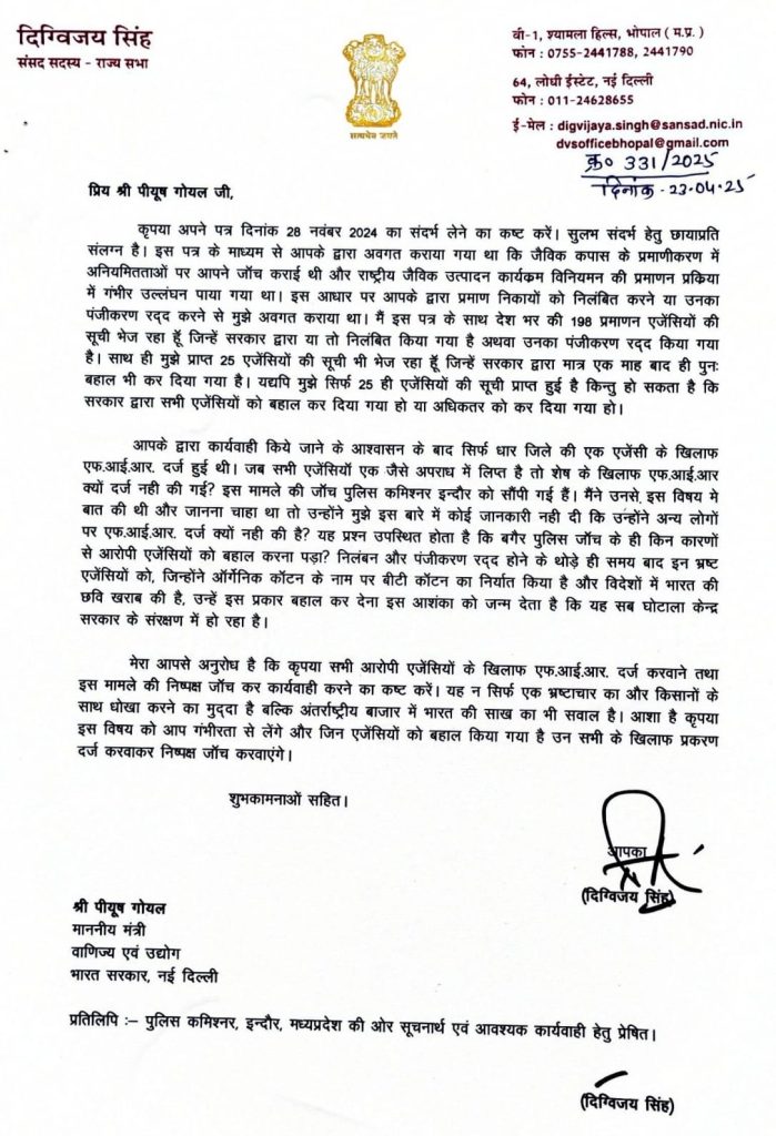 सुधीर दंतोडिया, भोपाल. राज्यसभा सांसद और पूर्व सीएम दिग्विजय सिंह ने भारत सरकार के वाणिज्य और उद्योग मंत्री पीयूष गोयल को पत्र लिखा है. जिसमें उन्होंने जैविक कपास के प्रमाणीकरण में अनियमितताओं के मामले में कार्रवाई की मांग की है. दिग्विजय सिंह ने बताया कि जैविक कपास के प्रमाणीकरण में अनियमितताओं के मामले में सरकार ने जांच कराई थी और कई एजेंसियों को निलंबित किया था. लेकिन आश्चर्यजनक रूप से, इन एजेंसियों को कुछ ही समय बाद बहाल कर दिया गया.