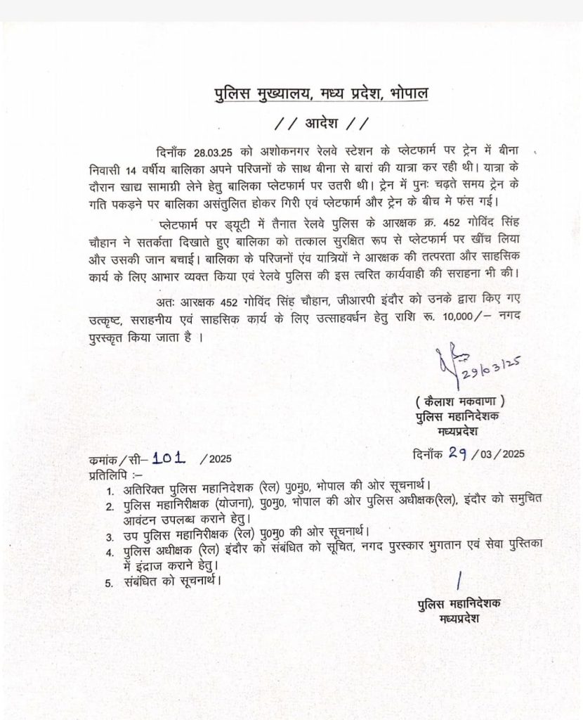 सुधीर दंडोतिया, भोपाल। मध्य प्रदेश के अशोक नगर रेलवे स्टेशन पर एक बालिका की जान बचाने वाले जीआरपी जवान को मध्य प्रदेश पुलिस के मुखिया कैलाश मकवाना ने 10 हजार रुपए का इनाम दिया है। साथ ही उसके बहादुरी की भी जमकर तारीफ की है। बता दें कि हाल ही में अशोक नगर रेलवे स्टेशन के प्लेटफार्म नंबर1 में एक लड़की चलती ट्रेन में चढ़ने का प्रयास कर रही थी, तभी अचानक उसका पैर फिसल गया। वह प्लेटफॉर्म के बीच में बने गैप में जा रही थी। इसी दौरान रेलवे जवान गोविंद सिंह चौहान ने देवदूत बनकर समय रहते उसे खींचकर बाहर किया। जिससे लड़की की जान बच पाई। यह घटना स्टेशन पर लगे सीसीटीवी कैमरे में भी कैद हो गई।