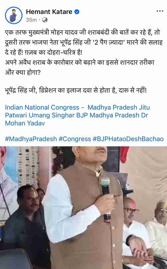 दरअसल, उपनेता प्रतिपक्ष हेमंत कटारे ने अपने आधिकारिक सोशल मीडिया प्लेटफॉर्म पर पूर्व मंत्री भूपेंद्र सिंह का एक कथित वीडियो पोस्ट किया है। जिसमें भूपेंद्र सिंह कहते दिखे, “आज होली मनाओ और 2 पैग ज्यादा पियो।” इसे शेयर करते हुए कटारे ने लिखा, “एक तरफ मुख्यमंत्री मोहन यादव जी शराबबंदी की बातें कर रहे हैं, तो दूसरी तरफ भाजपा नेता भूपेंद्र सिंह जी ‘2 पैग ज़्यादा’ मारने की सलाह दे रहे हैं! ग़ज़ब का दोहरा-चरित्र है। अपने अवैध शराब के कारोबार को बढ़ाने का इससे शानदार तरीका और क्या होगा? भूपेंद्र सिंह जी, डिप्रेशन का इलाज दवा से होता है, दारू से नहीं।”