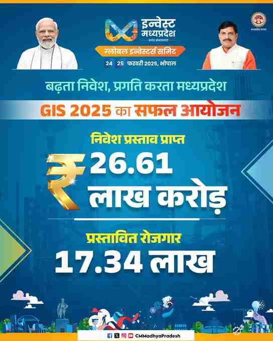 भोपाल। GIS 2025: मध्य प्रदेश की राजधानी भोपाल में चल रही दो दिवसीय ग्लोबल इन्वेस्टर समिट का आज समापन हुआ। समिट के अंतिम दिन गृह मंत्री अमित शाह मौजूद रहे। सीएम ने बताया कि 7 रीजनल इंडस्ट्री कॉन्क्लेव और ग्लोबल इन्वेस्टर्स समिट को मिलाकर अब तक प्रदेश में 30 लाख 77 हजार करोड़ रुपये के निवेश के MoU हुए हैं। वहीं GIS 2025 में 26.61 लाख करोड़ के निवेश प्रस्ताव मिले हैं जिससे 17.34 लाख प्रस्तावित रोजगार मिलेंगे।