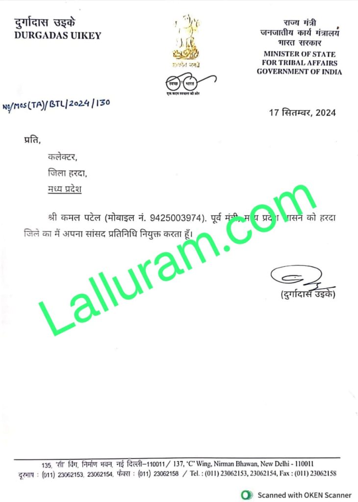 सुधीर दंडोतिया, भोपाल। भारतीय जनता पार्टी के कद्दावर नेता कमल पटेल सांसद व केंद्रीय मंत्री दुर्गादास उइके के सांसद प्रतिनिधि होंगे। केंद्रीय राज्य मंत्री दुर्गादास उइके ने अपने लेटर हेड पर जारी पत्र में पटेल को हरदा जिले का सांसद प्रतिनिधि नियुक्त किया है। यह प्रदेश के इतिहास में संभवत: पहला मौका होगा, जब कोई सीनियर नेता सांसद प्रतिनिधि की जिम्मेदारी संभालेंगे।