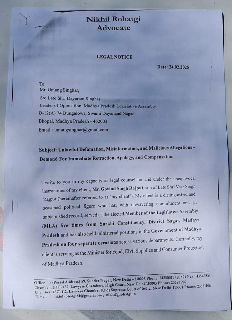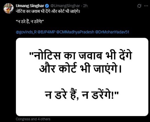 मंत्री के नोटिस का उमंग सिंघार ने दिया जवाब