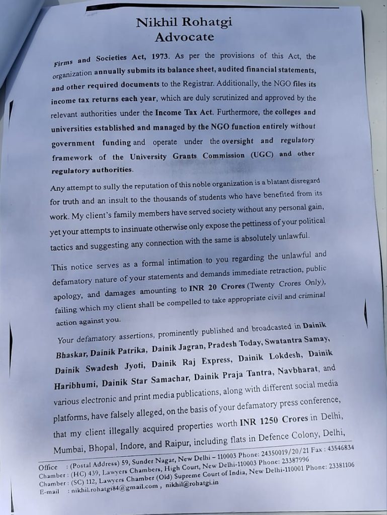 मंत्री के मानहानि नोटिस का नेता प्रतिपक्ष ने सोशल मीडिया पर जवाब दिया है। उन्होंने एक्स प्लेटफॉर्म पर लिखा, “नोटिस का जवाब भी देंगे और कोर्ट भी जाएंगे। न डरे हैं, न डरेंगे!”