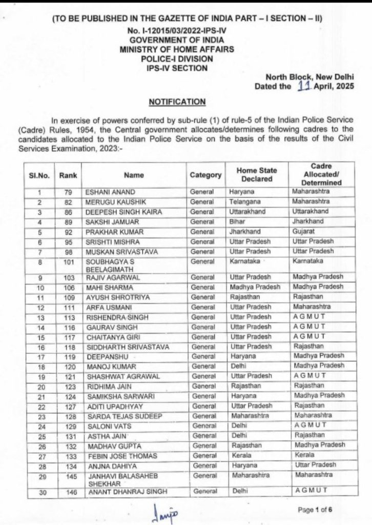 कैडर अलॉटमेंट नोटिफिकेशन के मुताबिक, आईपीएस रितु यादव, माधव अग्रवाल, काजल सिंह, अर्णव भंडारी और माही शर्मा को होम कैडर मध्य प्रदेश मिला है.