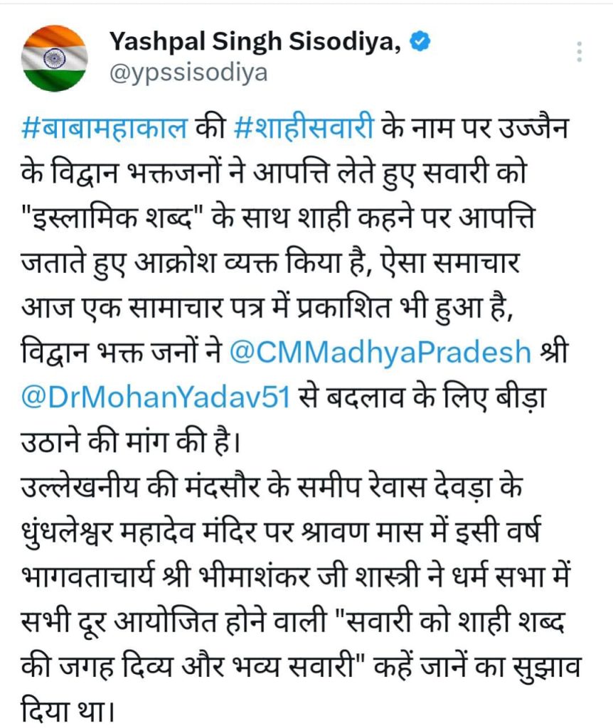 शब्बीर अहमद, भोपाल। महाकाल सवारी में ‘शाही’ शब्द को लेकर संतों के द्वारा आपत्ति जताई गई है। वहीं अब बीजेपी के पूर्व विधायक यशपाल सिसोदिया भी संतों के समर्थन में आ गए है। उन्होंने X पर ट्वीट करते हुए कहा कि शाही शब्द इस्लामिक शब्द है, उन्होंने सीएम मोहन यादव से नाम बदलने की मांग की है।