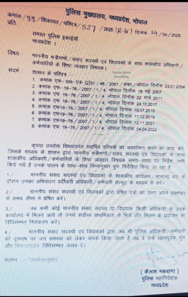 डीजीपी ने सांसदों, विधायकों के सम्मान को लेकर जारी निर्देश में आठ अलग-अलग परिपत्रों का जिक्र किया है। ये सर्कुलर पुलिस महकमे के अफसरों के लिए 23 जनवरी 2004, 18 मई 2007, 22 मार्च 2011, 24 अक्टूबर 2017, 19 जुलाई 2019, 11 दिसम्बर 2019, 12 नवम्बर 2021 तथा 4 अप्रेल 2022 को शासन द्वारा जारी किए गए हैं।