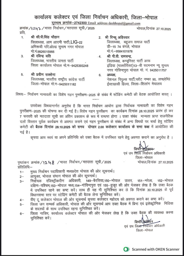 मान्यता प्राप्त राजनैतिक दलों को कार्यक्रम की जानकारी देने और ‘SIR’ से संबंधित विषयों पर चर्चा करने के लिए स्टैंडिंग कमेटी की बैठक कल दोपहर 2 बजे कलेक्टर कार्यालय के सभाकक्ष में आयोजित की गई है।