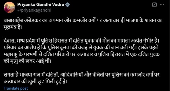 इस मामले में कांग्रेस सांसद प्रियंका गांधी का भी बयान सामने आया है। उन्होंने कहा कि बाबासाहेब अंबेडकर का अपमान और कमजोर वर्गों पर अत्याचार ही भाजपा के शासन का मूलमंत्र है। देवास, मध्य प्रदेश में पुलिस हिरासत में दलित युवक की मौत का मामला अत्यंत गंभीर है। परिवार का आरोप है कि पुलिस क्रूरता की वजह से युवक की जान चली गई। इसके पहले महाराष्ट्र के परभणी से दलित परिवारों पर अत्याचार व पुलिस हिरासत में एक दलित युवक की मृत्यु की खबर आई थी। लगता है भाजपा राज में दलितों, आदिवासियों और वंचितों पर पुलिस को कमजोर वर्गों पर अत्याचार की खुली छूट मिली हुई है।