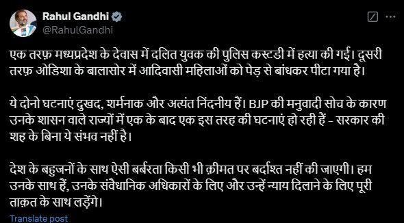 राहुल गांधी ने X पर पोस्ट करते हुए लिखा कि एक तरफ़ मध्यप्रदेश के देवास में दलित युवक की पुलिस कस्टडी में हत्या की गई। दूसरी तरफ़ ओडिशा के बालासोर में आदिवासी महिलाओं को पेड़ से बांधकर पीटा गया है। ये दोनो घटनाएं दुखद, शर्मनाक और अत्यंत निंदनीय हैं। BJP की मनुवादी सोच के कारण उनके शासन वाले राज्यों में एक के बाद एक इस तरह की घटनाएं हो रही हैं – सरकार की शह के बिना ये संभव नहीं है। देश के बहुजनों के साथ ऐसी बर्बरता किसी भी कीमत पर बर्दाश्त नहीं की जाएगी। हम उनके साथ हैं, उनके संवैधानिक अधिकारों के लिए और उन्हें न्याय दिलाने के लिए पूरी ताकत के साथ लड़ेंगे।