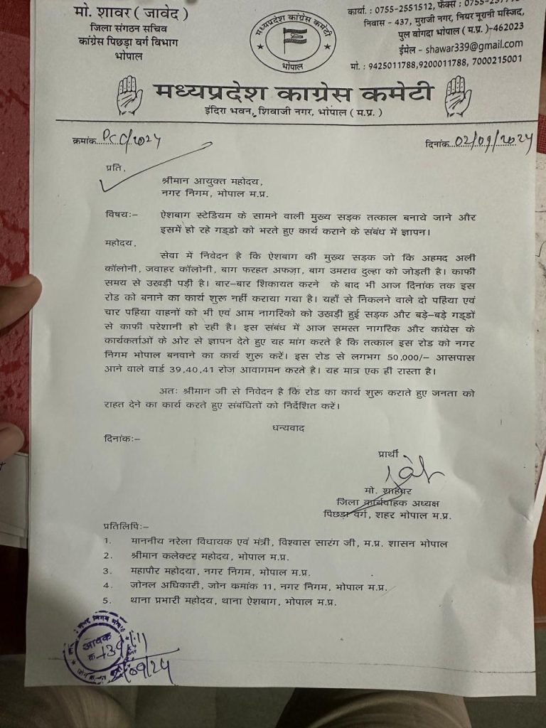 उन्होंने प्रशासन को एक शिकायती पत्र लिखा है। उन्होंने मांग की है कि, शबाग की मुख्य सड़क जो कि अहमद अली कॉलोनी, जवाहर कॉलोनी, बाग फरहत अफज़ा, बाग उमराव दुल्हा को जोड़ती है। काफी समय से उखड़ी पड़ी है। बार-बार शिकायत करने के बाद भी इस रोड को बनाने का कार्य शुरू नहीं कराया गया है।यहां से निकलने वाले दो पहिया, चार पहिया वाहनों और नागरिको को उखड़ी हुई सड़क और बड़े-बड़े गड्डों से काफी परेशानी हो रही है। इस संबंध में आज समस्त नागरिक और कांग्रेस के कार्यकर्ताओं के ओर से ज्ञापन देते हुए यह मांग करते हैं कि तत्काल इस रोड को नगर निगम भोपाल बनवाने का कार्य शुरू करें।