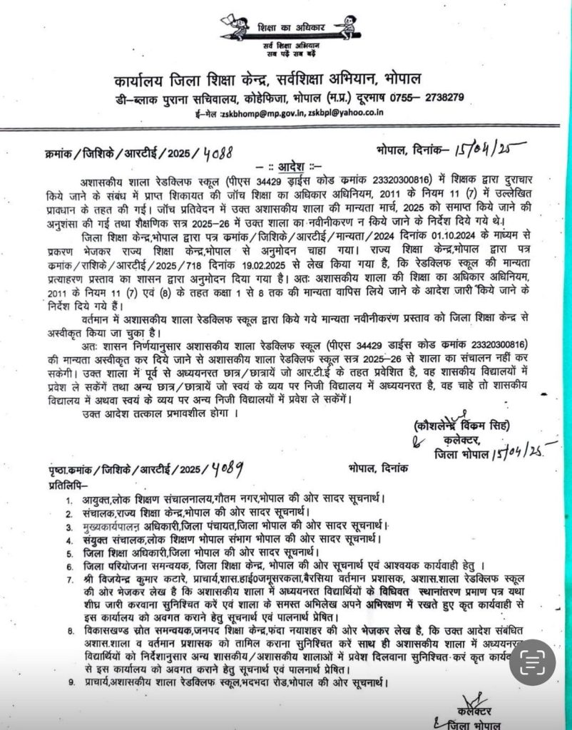 शिखिल ब्यौहार, भोपाल। मध्य प्रदेश की राजधानी भोपाल में 3 साल की बच्ची के साथ दुष्कर्म मामले में बड़ा एक्शन लिया गया है। स्कूल शिक्षा विभाग ने रेडक्लिफ स्कूल की मान्यता रद्द कर दी है। भोपाल कलेक्टर कौशलेंद्र विक्रम सिंह ने गुरुवार (17 अप्रैल) को इसके आदेश जारी किए है। उनकी इस कार्रवाई के बाद रेडक्लिफ स्कूल का संचालन 2025-26 में नहीं हो पाएगा।