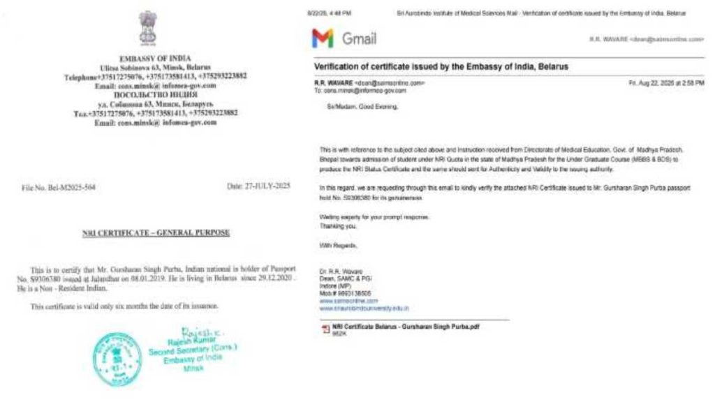 फर्जी सर्टिफिकेट ट्रेजर टाउन निवासी बलदेव रामानी के नाम से बनवाया गया था। यह सर्टिफिकेट 7 जुलाई को गुरुशरण सिंह के नाम पर जारी दिखाया गया, जिसमें उसे मूल निवासी जालंधर और 2020 से बेलारूस का रेजिडेंट बताया गया। यही नहीं, इसी फर्जी एनआरआई सर्टिफिकेट के आधार पर छात्र को डायरेक्टर मेडिकल एजुकेशन काउंसलिंग में सीट भी अलॉट हो चुकी थी।