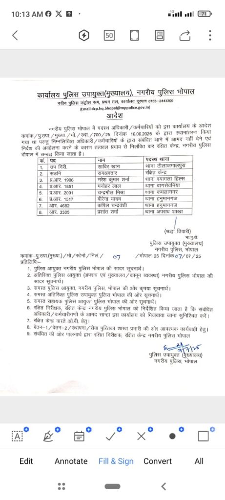 शब्बीर अहमद, भोपाल। मध्यप्रदेश की राजधानी भोपाल से पुलिस विभाग की बड़ी खबर सामने आई है। यहां 8 पुलिसकर्मियों को सस्पेंड कर दिया गया है। सभी पुलिसकर्मी ट्रांसफर के आदेश को नहीं मान रहे थे। इनमें से किसी ने भी ट्रांसफर वाली जगह पर आमद नहीं दी थी।