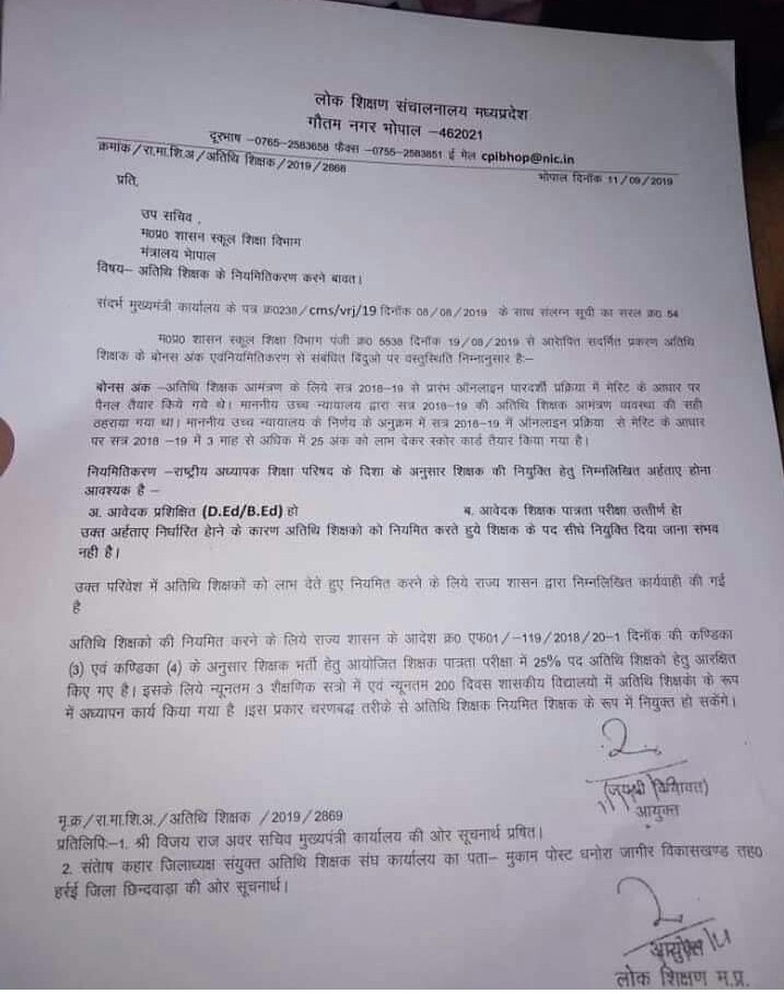 शिखिल ब्यौहार, भोपाल। नियमितीकरण की मांग कर रहे अतिथि शिक्षक के लिए बड़ी खबर है। आंदोलन के बावजूद अतिथि शिक्षकों को निराशा हाथ लगी है। अतिथि शिक्षक बिना परीक्षा दिए नियमित नहीं होंगे। भर्ती में सिर्फ 25% आरक्षण मिलेगा। हाईकोर्ट के आदेश पर डीपीआई ने मामले का निराकरण कर दिया है। अतिथि शिक्षकों को सीधे नियमित नहीं किया जाएगा। बिना भर्ती परीक्षा में शामिल हुए नियमित नहीं हो पाएंगे। मध्यप्रदेश के 70 हजार स्कूलों में अतिथि शिक्षक काम कर रहे है। अतिथि शिक्षक पिछले 10 से लेकर 12 साल से नियमितीकारण की मांग कर रहे हैं। डीपीआई के द्वारा किए गए निराकरण के बाद अब अतिथि शिक्षक सुप्रीम कोर्ट जाएंगे.