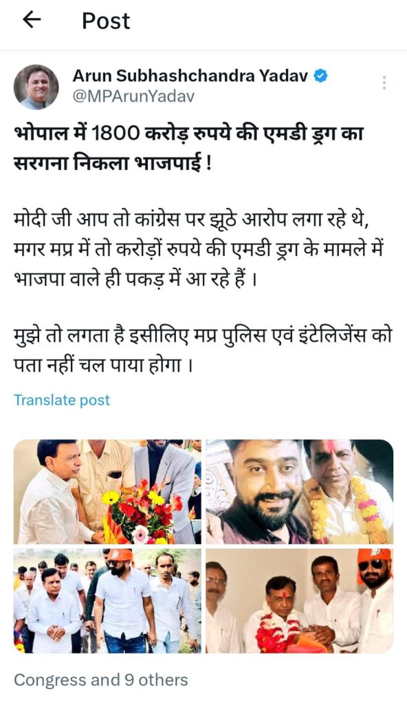 शब्बीर अहमद, भोपाल। मध्यप्रदेश की राजधानी भोपाल के समीप औद्योगिक क्षेत्र के बंद फैक्ट्री में एमडी ड्रग्स मामले में फैक्ट्री मालिक एस के सिंह को पुलिस ने गिरफ्तार किया है। पूर्व मालिक जयदीप भोपाल से बाहर है, पुलिस आरोपी को तलाश कर रही है। इधर आरोपी के भाजापाई होने पर कांग्रेस ने सरकार पर निशाना साधा है। कांग्रेस अरुण यादव ने मामले को लेकर ट्वीट किया है।