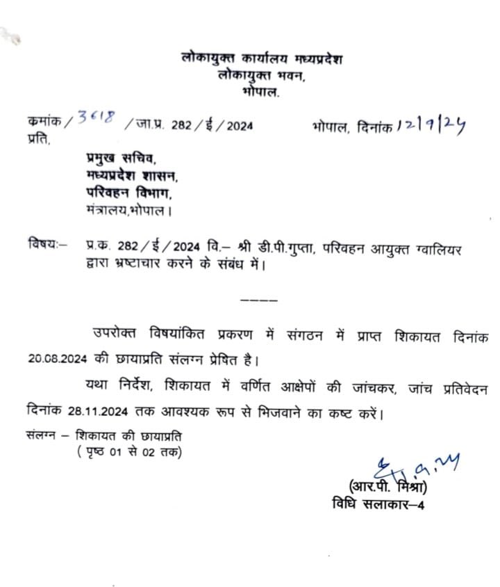 दरअसल शिकायत पत्र में परिवहन आयुक्त डीपी गुप्ता के विरुद्ध करप्शन की शिकायत का जिक्र था। लोकायुक्त पुलिस संगठन ने शासन से जांच कर प्रतिवेदन मांगा था। लोकायुक्त संगठन ने प्रमुख सचिव परिवहन विभाग को 12 सितंबर 2024 को पत्र लिखा था। पत्र लिखकर परिवहन आयुक्त के खिलाफ दो पेज में की गई शिकायत की जांच रिपोर्ट मांगी गई थी। परिवहन आयुक्त के खिलाफ आर्थिक अनियमितता की शिकायत लगातार मिल रही थी।