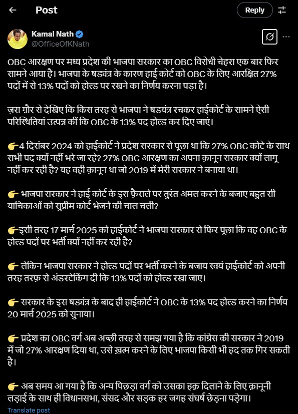 कमलनाथ ने आगे लिखा, ‘इसी तरह 17 मार्च 2025 को हाईकोर्ट ने भाजपा सरकार से फिर पूछा कि वह OBC के होल्ड पदों पर भर्ती क्यों नहीं कर रही है? लेकिन भाजपा सरकार ने होल्ड पदों पर भर्ती करने के बजाय स्वयं हाईकोर्ट को अपनी तरह तरफ़ से अंडरटेकिंग दी कि 13% पदों को होल्ड रखा जाए। सरकार के इस षड्यंत्र के बाद ही हाईकोर्ट ने OBC के 13% पद होल्ड करने का निर्णय 20 मार्च 2025 को सुनाया।’