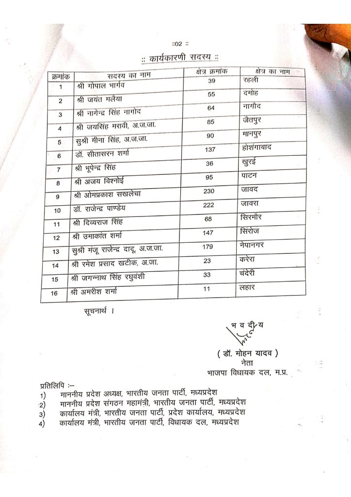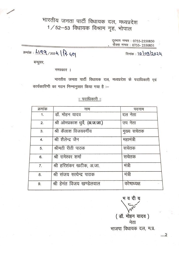 शब्बीर अहमद, भोपाल। मध्य प्रदेश बीजेपी ने विधायक दल की कार्यकारिणी गठित कर दी है। मुख्यमंत्री डॉ. मोहन यादव MLA दल के नेता चुने गए हैं। वहीं ओमप्रकाश धुर्वे को उपनेता बनाया गया है। कैलाश विजयवर्गीय को मुख्य सचेतक की जिम्मेदारी सौंपी गई है। सचेतक की भूमिका में दो विधायक रीति पाठक और रामेश्वर शर्मा हैं। हरिशंकर खटीक और सत्येंद्र पाठक मंत्री हैं। वहीं विधायक विजय खंडेलवाल को कोषाध्यक्ष बनाया गया है।