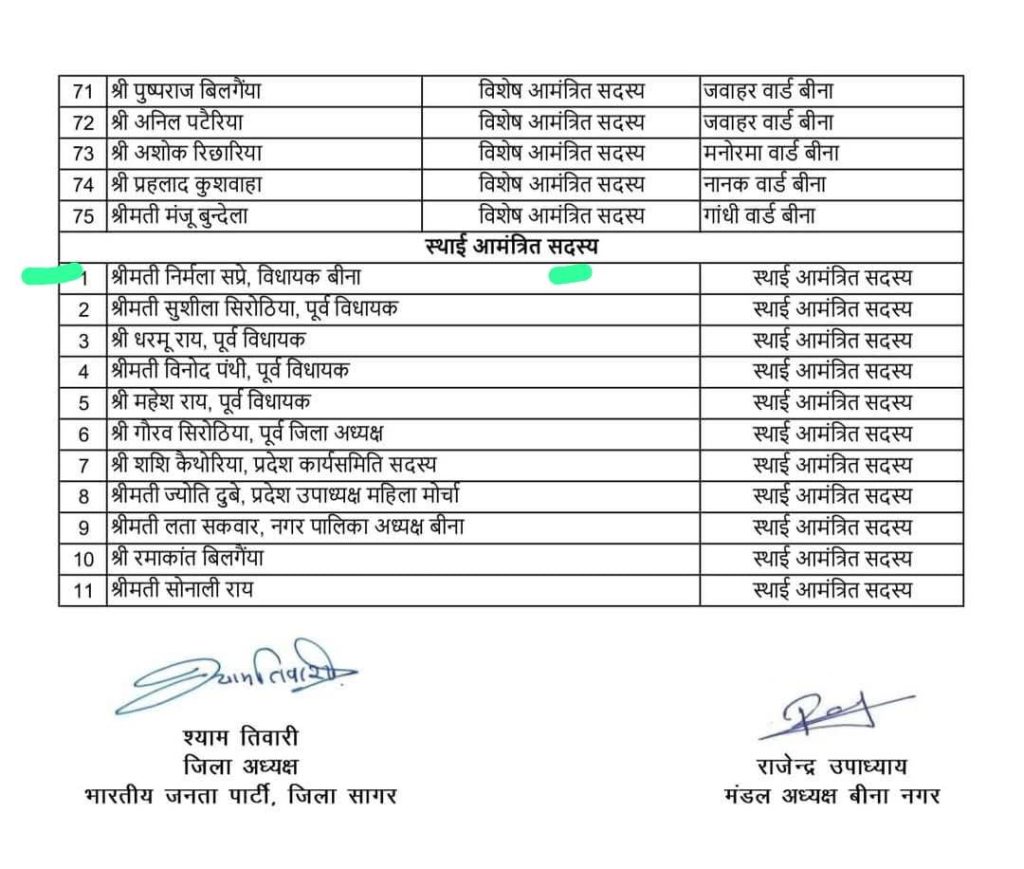 उमेश यादव, सागर। जिले की बीना सीट से कांग्रेस के टिकट पर जीती निर्मला सप्रे एक बार फिर चर्चा में है। बीजेपी जिला अध्यक्ष श्याम तिवारी द्वारा जारी बीना मंडल की कार्यकारणी लिस्ट में विधायक निर्मला सप्रे को स्थायी आमंत्रित सदस्य नियुक्त किया गया। लिस्ट के वायरल होने और सोशल मीडिया में चर्चा के बाद जिला अध्यक्ष ने संशोधित सूची जारी कर उनका नाम हटा दिया है।