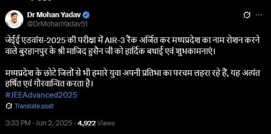 सीएम ने एक्स पर लिखा- जेईई एडवांस-2025 की परीक्षा में AIR-3 रैंक अर्जित कर मध्य प्रदेश का नाम रोशन करने वाले बुरहानपुर के माजिद हुसैन को हार्दिक बधाई एवं शुभकामनाएं. मध्य प्रदेश के छोटे जिलों से भी हमारे युवा अपनी प्रतिभा का परचम लहरा रहे हैं, यह अत्यंत हर्षित और गौरवान्वित करता है.