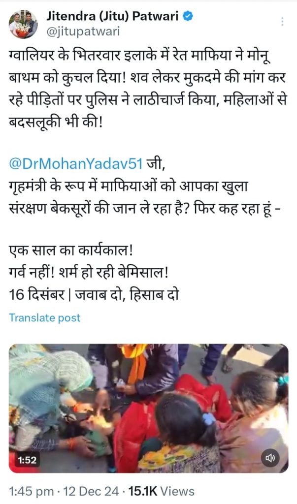 बता दें कि इकहरा गांव निवासी मोनू बाथम को रेत से भरे ट्रैक्टर ने 10 दिसम्बर मंगलवार की रात टक्कर मार दी थी जिसमें मोनू बाथम की दर्दनाक मौत हो गई थी। मामले में कार्रवाई को लेकर परिजनों ने 11 दिसम्बर बुधवार की सुबह भितरवार थाने के बाहर शव रखकर जाम लगाया था। आक्रोशित परिजनों पर पुलिस ने बल प्रयोग किया और जाम खुलवाया था।Lalluram.com ने भी इस खबर को प्रमुखता से प्रकाश किया था जिस पर अब पुलिस के बल प्रयोग को लेकर कांग्रेस प्रदेश अध्यक्ष जीतू पटवारी ने मुख्यमंत्री मोहन यादव को X पर पोस्ट किया और जवाब मांगा है।