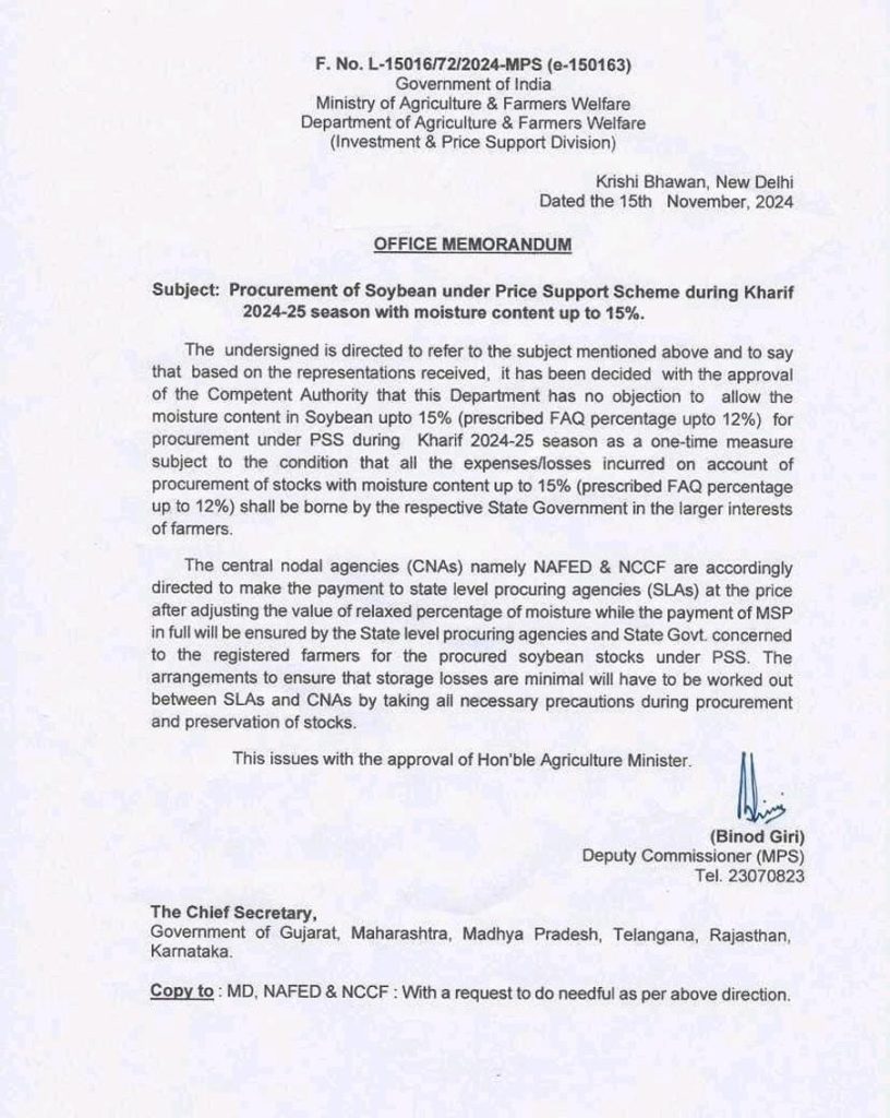 शिखिल ब्यौहार, भोपाल। केंद्र की मोदी सरकार ने किसानों को तोहफा दिया है। सोयाबीन में नमी होने पर भी एमएसपी (MSP) मिलेगी। इस संबंध में केंद्रीय कृषि मंत्रालय की मंजूरी पर निर्देश जारी किया है। 15 परसेंट नमी वाले सोयाबीन पर MSP मिलेगी। मध्यप्रदेश समेत गुजरात, कर्नाटक, महाराष्ट्र, तेलंगाना और राजस्थान को केंद्र ने निर्देश दिए है। इससे पहले 12 परसेंट तक नमी पर ही MSP मिलती थी।
