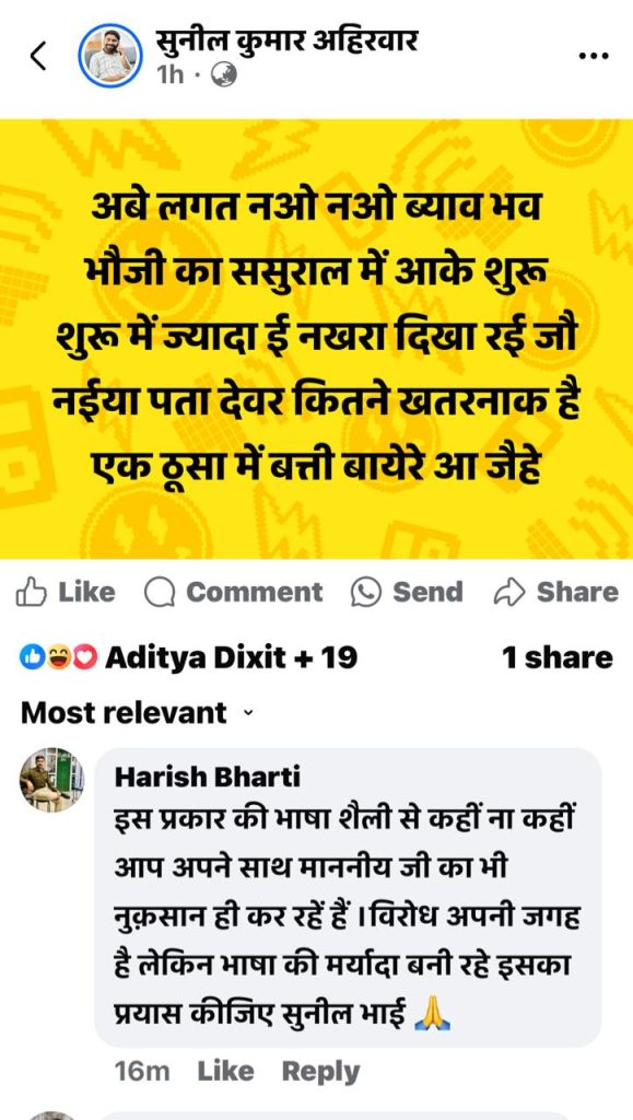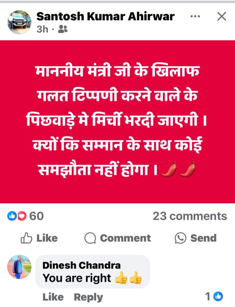 लेकिन इस प्रदर्शन पर उनके समर्थक संतोष कुमार अहिरवार भड़क उठे। उन्होंने सोशल मीडिया पर लिखा, “माननीय मंत्री जी के खिलाफ गलत टिप्पणी करने वाले के @$%* में मिर्ची भर दी जाएगी। क्योंकि सम्मान के साथ कोई समझौता नहीं होगा।” वहीं सुनील कुमार अहिरवार नाम के शख्स ने भी इस पर विवादित टिप्पणी लिखी है।