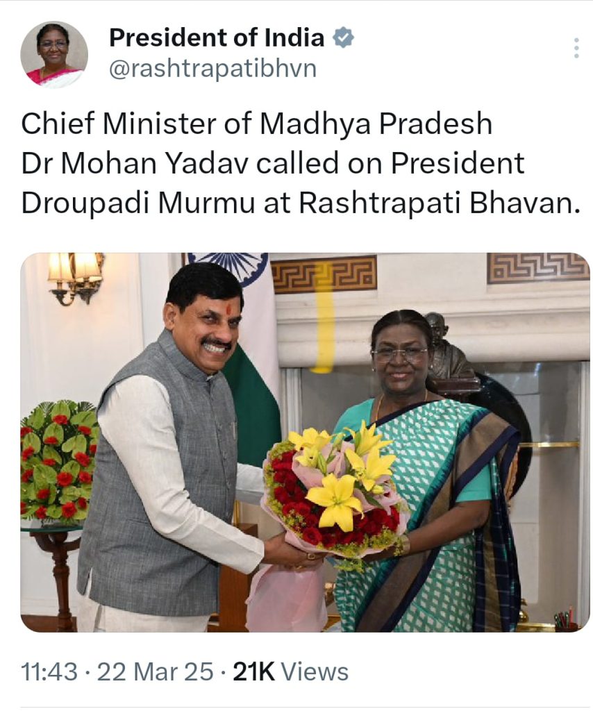 मुख्यमंत्री डॉ. मोहन यादव आज दिल्ली दौरे पर थे। इस दौरान वे राष्ट्रपति भवन पहुंचे। राष्ट्रपति द्रौपदी मुर्मू से मुलाकात के बाद उन्होंने कहा, “महामहिम राष्ट्रपति और गृहमंत्री अमित शाह से मुलाकात कर उनके प्रति आभार व्यक्त किया। उम्मीद करता हूं कि बहुत जल्द उनकी तारीख तय होगी और वे हमें आशीर्वाद देने के लिए आएंगे।”