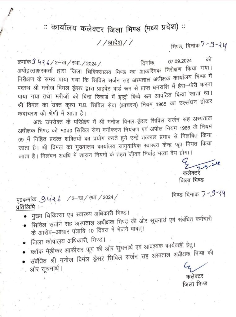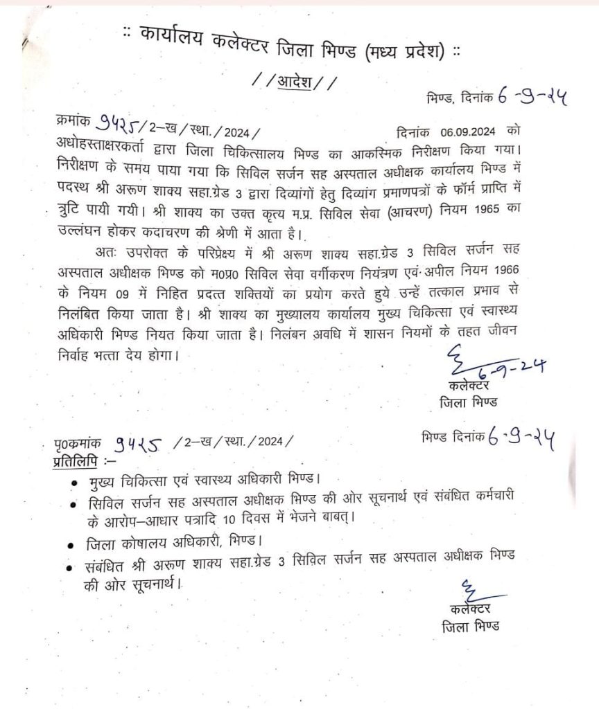 कलेक्टर ने जिला अस्पताल के एक कर्मचारी को प्रायवेट वार्ड रूम से प्राप्त धन राशि में हेरा-फेरी करने व दूसरे कर्मचारी को दिव्यांग प्रमाण पत्रों के फार्म प्राप्ति में त्रुटि पाए जाने के कारण निलंबित किया है। बीते दिनों फर्जी जन्म प्रमाण पत्र व दिव्यांगता प्रमाण पत्र को जल्द बनवाने के लिए मांगी गई रिश्वत के मामले में भी कलेक्टर ने जांच पड़ताल की। दिव्यंगता प्रमाण पत्र बनवाने के लिए रिश्वत मांगे जाने वाले मामले में कलेक्टर ने दिव्यांग से की बातचीत और पूरे मामले को गंभीरता से सुना। जिला अस्पताल के सिविल सर्जन डॉ आर के मिश्रा के उदासीन रवैए के चलते जिला अस्पताल में अव्यवस्थाओं का आलम है। सिविल सर्जन कार्यालय में कलेक्टर और अस्पताल प्रबंधन के स्टाफ की बातचीत का किसी ने गोपनीय तरीके से वीडियो बनाकर वायरल कर दिया था।