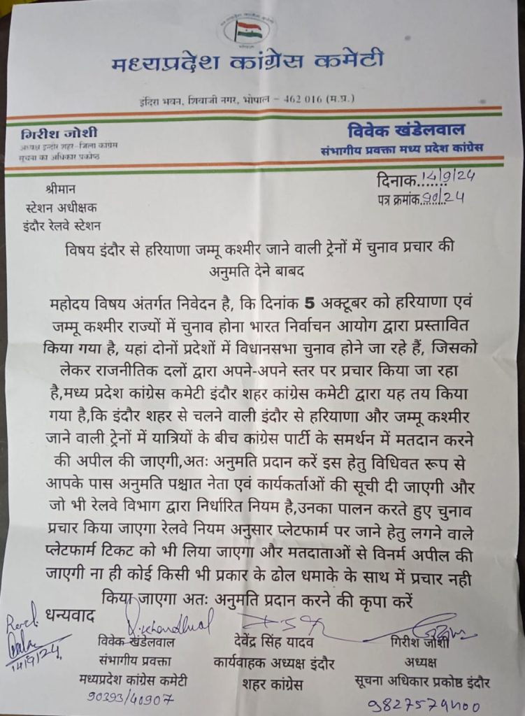 हेमंत शर्मा, इंदौर। मध्य प्रदेश में राजनीतिक सरगर्मियां बढ़ती नजर आ रही है. जहां कांग्रेस ने इंदौर रेलवे स्टेशन पर एक अनोखी पहल की है. कांग्रेस नेताओं ने जम्मू-कश्मीर और हरियाणा विधानसभा चुनावों के मद्देनजर इंदौर से प्रस्थान करने वाली ट्रेनों में यात्रियों से प्रचार करने की अनुमति मांगी है. कांग्रेस के संभागीय प्रवक्ता विवेक खंडेलवाल और सूचना अधिकार प्रकोष्ठ के अध्यक्ष गिरीश जोशी के नेतृत्व में एक प्रतिनिधिमंडल ने स्टेशन अधीक्षक प्रवीण पाराशर को ज्ञापन सौंपा है.