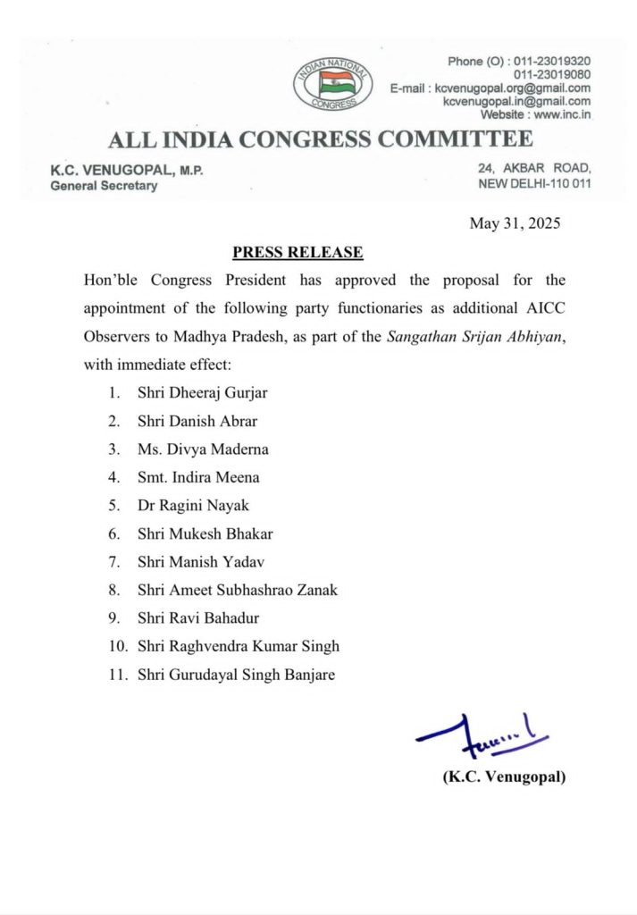 शब्बीर अहमद, भोपाल। मध्य प्रदेश में होने वाले ‘संगठन सृजन अभियान’ के लिए कांग्रेस जोर-शोर से तैयारी करने में जुटी है। इस बीच 11 ऑब्जर्वर के नाम का ऐलान कर दिया गया है। इसे लेकर AICC ने लिस्ट जारी कर दी है।