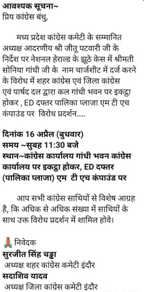 जैसे ही मीडिया ने यह जानकारी उजागर की, कांग्रेस के नेता बैकफुट पर आ गए और जल्दबाजी में कांग्रेस कार्यालय में बैठक करते नजर आए। खबर लिखे जाने तक यह साफ नहीं हो पाया था कि अब प्रदर्शन कहां किया जाएगा। इस पूरे मामले पर भाजपा प्रदेश प्रवक्ता नरेंद्र सलूजा ने कांग्रेसियों पर तंज कसते हुए कहा, “इंदौर के कांग्रेस नेता गांधी परिवार की चापलूसी में ही व्यस्त हैं। इन्हें मांग करनी चाहिए कि इस पूरे मामले की निष्पक्ष जांच हो और जो दोषी हो उसे सजा मिले। लेकिन इन्हें तो इतना भी नहीं पता कि ईडी का कार्यालय अब नेहरू पार्क में है। जब इन्हें दफ्तर की जानकारी तक नहीं, तो जनता की आवाज कैसे उठाएंगे?”