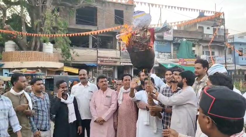 सतीश दुबे, डबरा (ग्वालियर). अग्रसेन चौराहे पर कांग्रेस विधायक सुरेश राजे और कार्यकर्ताओं ने नारेबाजी कर विजय शाह का पुतला दहन किया और मंत्री पद से इस्तीफा देने की मांग की.