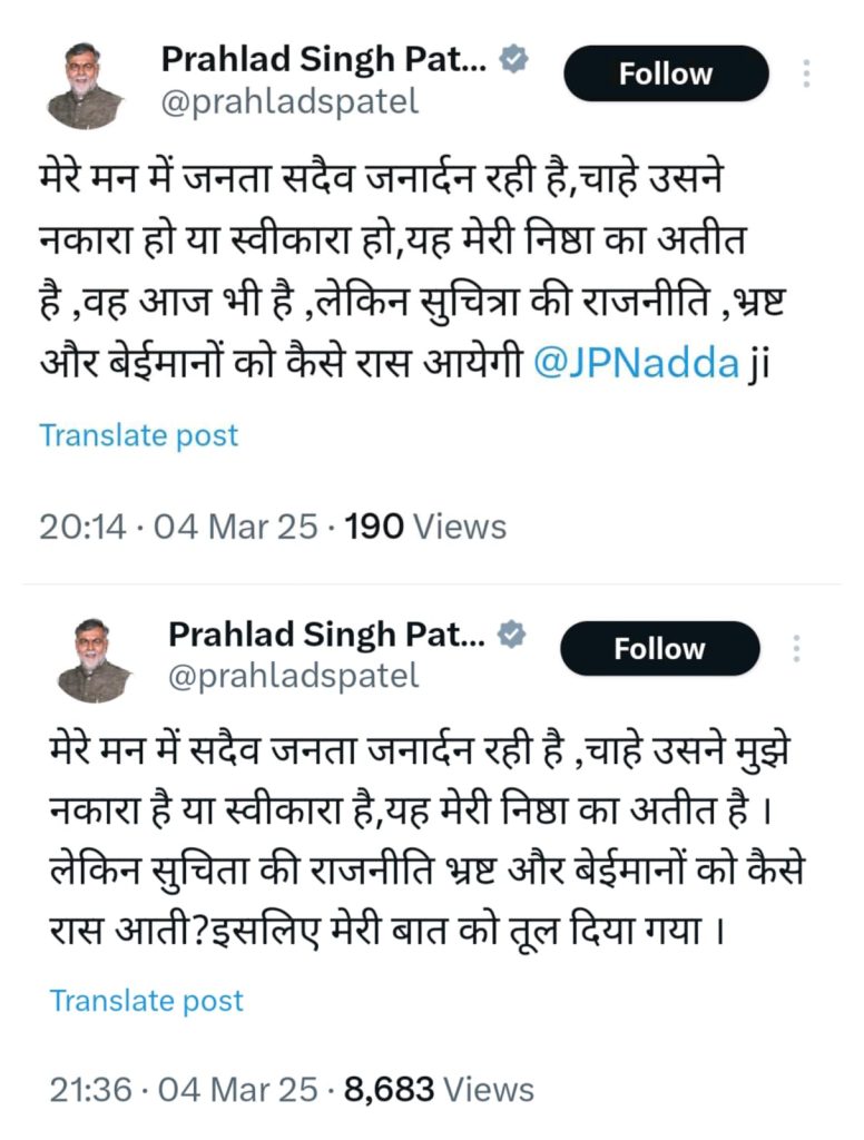 मंत्री प्रहलाद पटेल ने मंगलवार की रात 8:14 बजे X पर बीजेपी के राष्ट्रीय अध्यक्ष जेपी नड्डा को टैग करते हुए लिखा था कि मेरे मन में जनता सदैव जनार्दन रही, उसने नकारा हो या स्वीकारा हो, यह मेरी निष्ठा का अतीत है, वह आज भी है, लेकिन शुचिता की राजनीति, भ्रष्ट और बेईमानों को कैसे रास आएगी। अगली पोस्ट में जेपी नड्डा को टैग नहीं किया, मंत्री पटेल ने अपना पोस्ट डिलीट कर करीब सवा घंटे बाद 9:36 बजे दूसरा पोस्ट किया, लेकिन जेपी नड्डा को उन्होंने टैग नहीं किया।