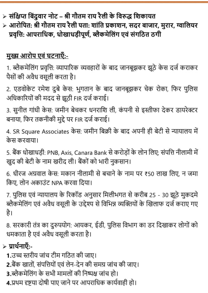 दरअसल षडयंत्र पूर्वक राशि हड़पने और बंधक जमीन को छुड़ाने का झांसा देकर धोखाधड़ी का आरोप है। व्यापारी से एक करोड़ 30 लाख की धोखाधड़ी के लिए धमकाया गया था। सभी के खिलाफ मुरार थाने में मामला दर्ज हुआ है।