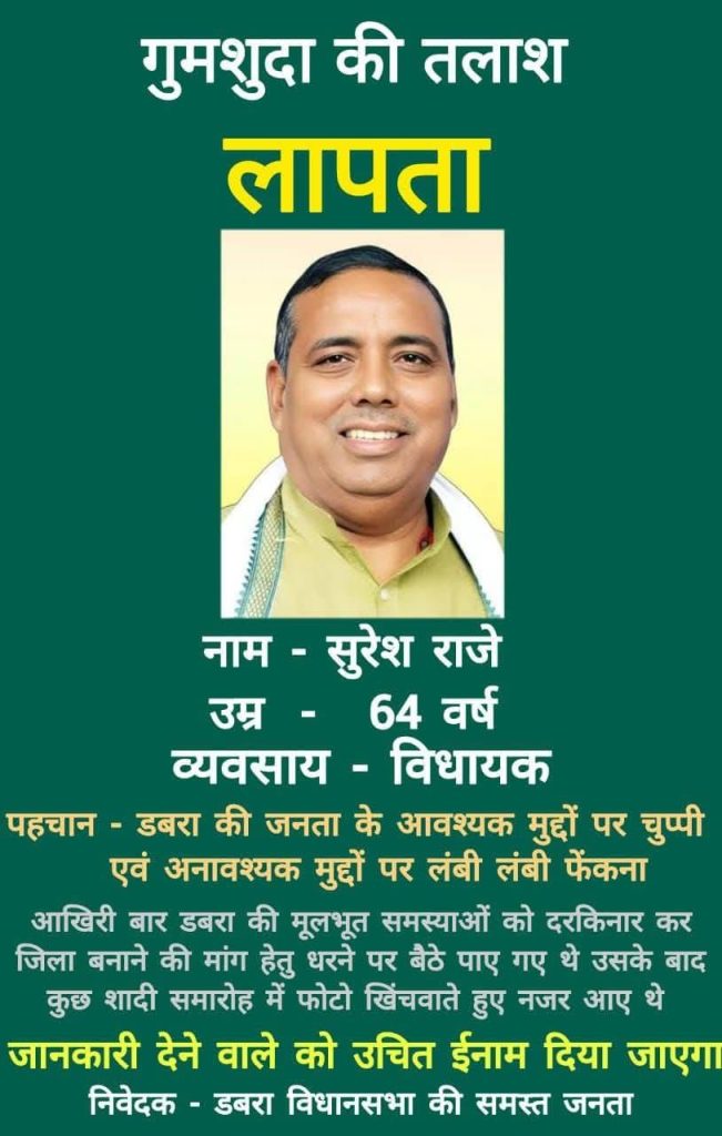 वायरल पोस्टर पर लिखा, गुमशुदा की तलाश. डबरा की जनता के मुद्दों पर चुप्पी साधना और अनावश्यक मुद्दों पर फेंकना है. आखिरी बार डबरा की मूलभूत समस्याओं को दरकिनार कर जिला बनाने की मांग के लिए धरने पर बैठे पाए गए थे. उसके बाद कुछ शादी समारोह में फोटो खिंचवाते हुए नजर आए थे.